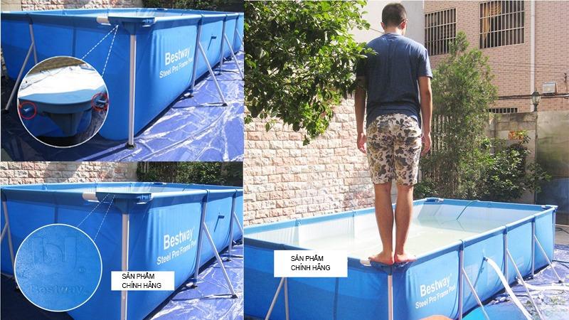 - VC 3 lớp đảm bảo độ bền đến 10 năm. Các sản phẩm bể bơi khung kim loại luôn được kiểm tra kĩ lưỡng trước khi xuất xưởng. Ba bài test quan trọng gồm: 1. Test áp suất nước, 2. Test để ngoài thời tiết nắng nóng, 3. Test dưới thời tiết đóng băng.