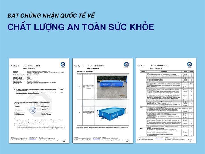 - Là sản phẩm đa quốc gia, chất lượng sản phẩm được kiểm định nghiêm ngặt tại các thị trường Châu Âu, đảm bảo các thành phần cấu tạo bể bơi khung kim loại an toàn sức khỏe, thân thiện môi trường.