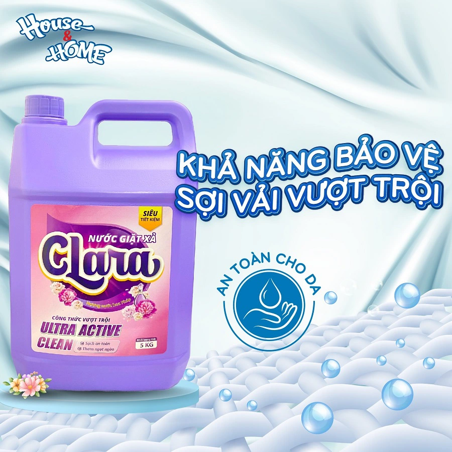 Công nghệ Ultra Active Clean là công nghệ làm sạch ưu việt được nghiên cứu bởi đội ngũ chuyên viên phát triển sản phẩm tận tâm của House&HOME, được ứng dụng trong Nước giặt xả Clara đây là sự kết hợp hài hòa giữa 2 sức mạnh làm sạch và bảo vệ sợi vải giúp cho áo quần luôn sạch sẽ, mềm mại.
